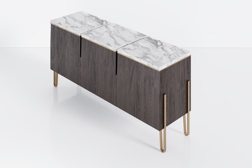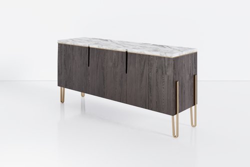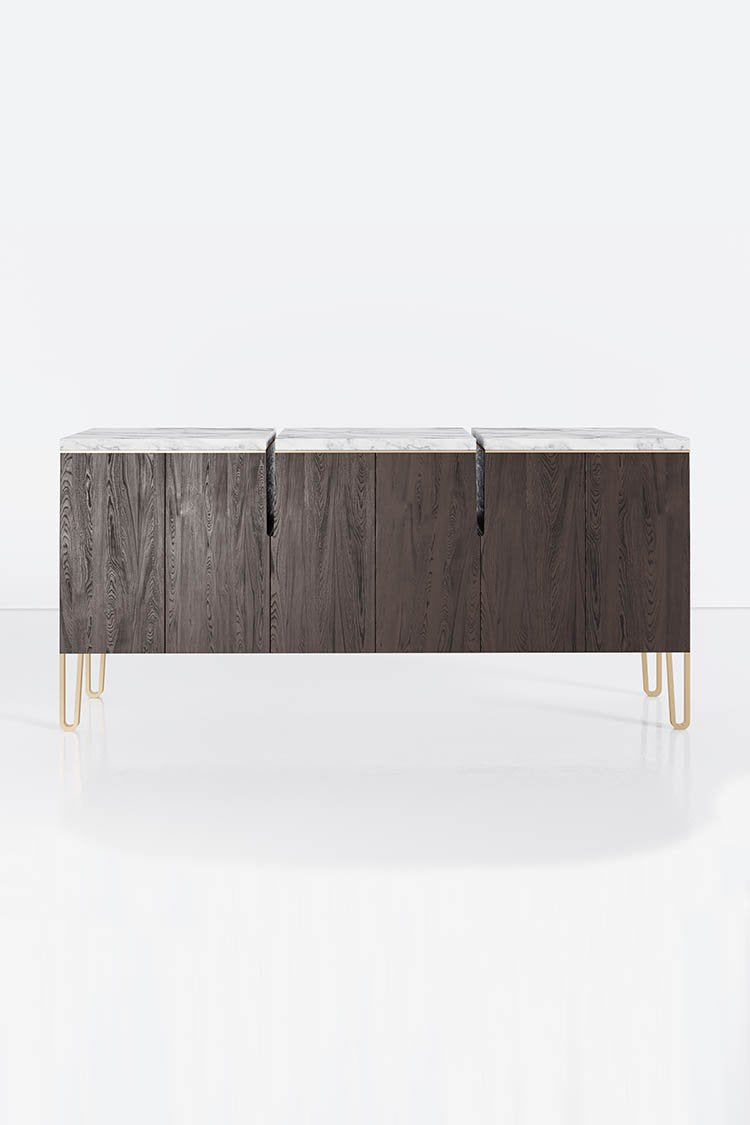 The Ballena Cabinet is supported on elliptical legs: its components subtly pulling away from each other to create three discrete storage units