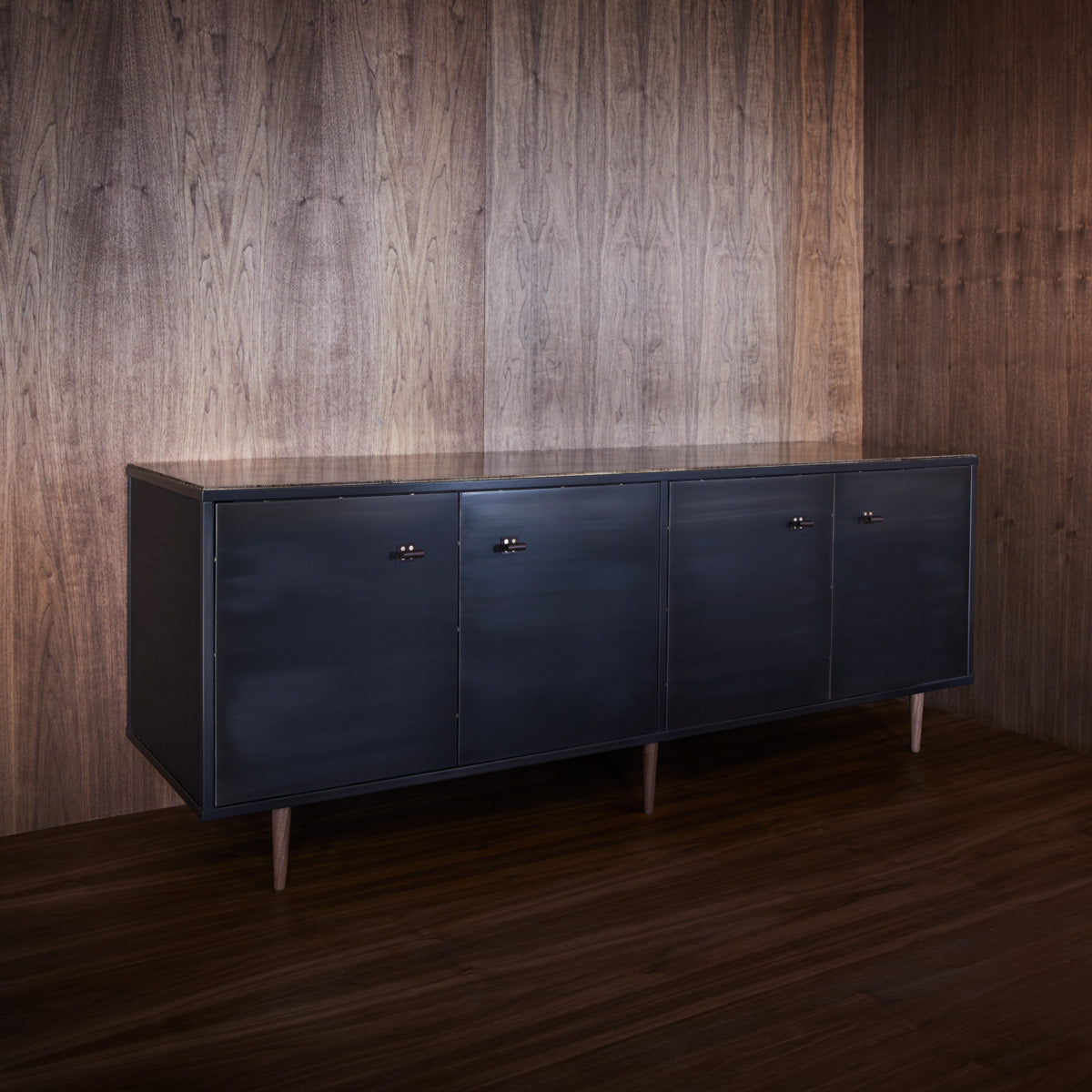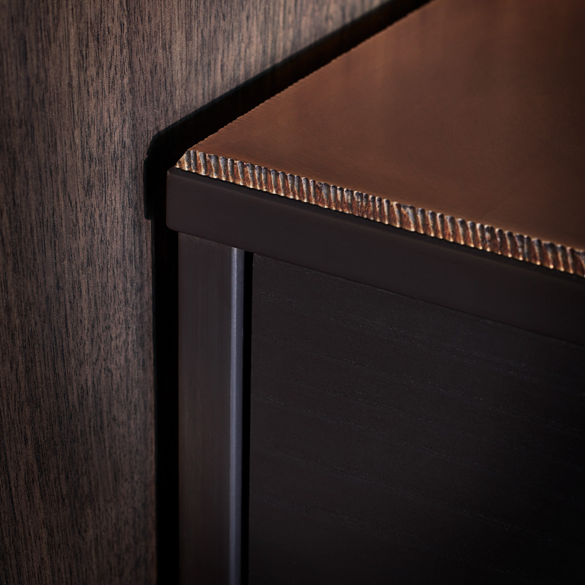 Metal patina doors on metal frame with wood panels and adjustable interior wood shelving, hand-turned walnut legs and brass screw details