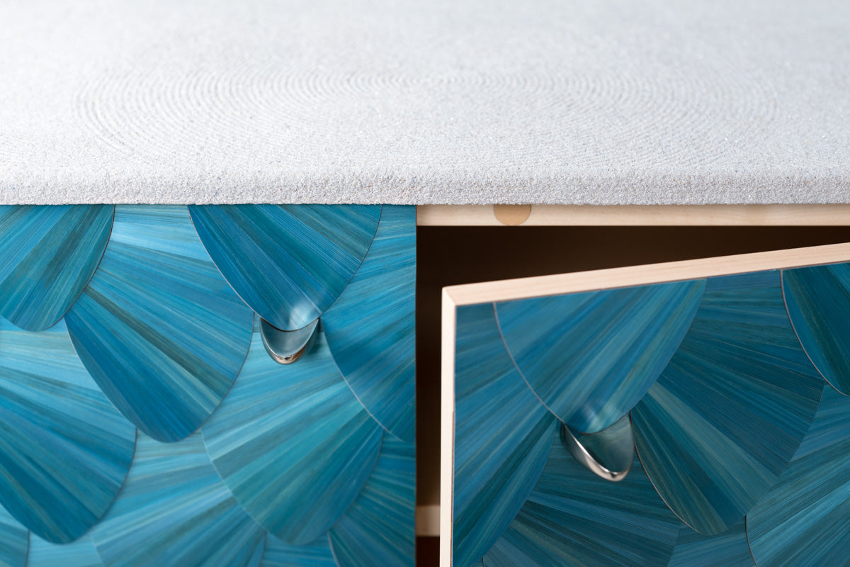 The repetitive patterns on the top of the cabinet recall the drawings of a Japanese garden, a space conducive to reflection and meditation, a vital element to bring the artist to recharge his batteries