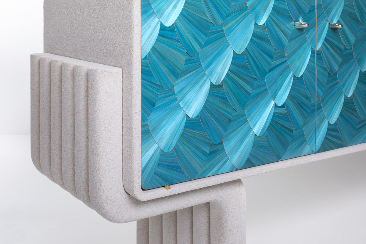 The unique combination of white sand and scales in azure blue straw marquetry immediately evokes this need for freedom
