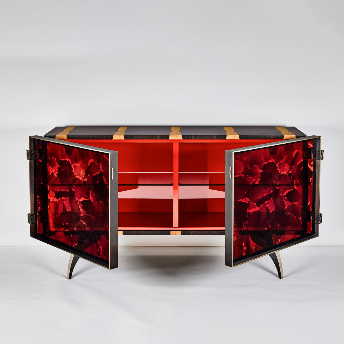 Two door credenza in rare zircote veneer wood with contrast lacquer interior, fallen leaf resin doors, cast brass hinges and feet.