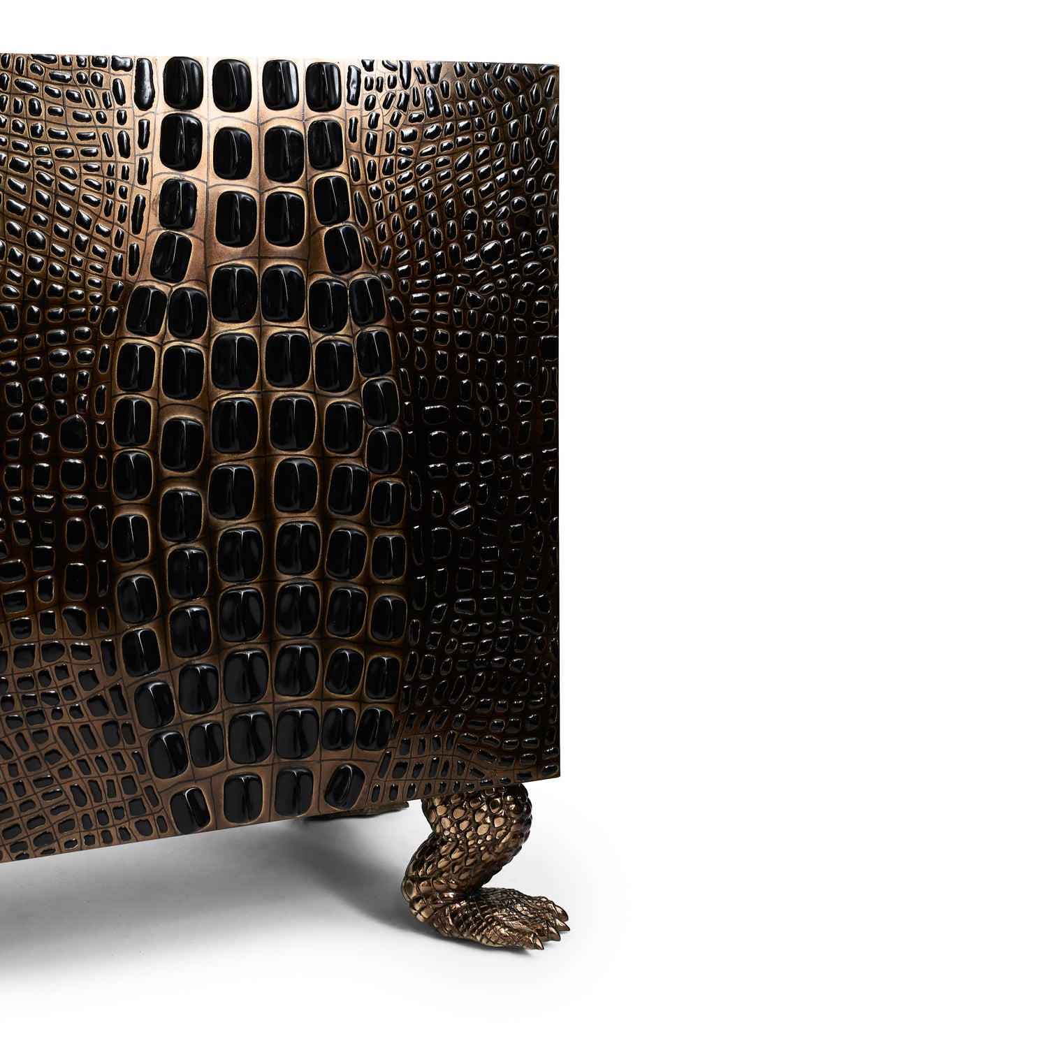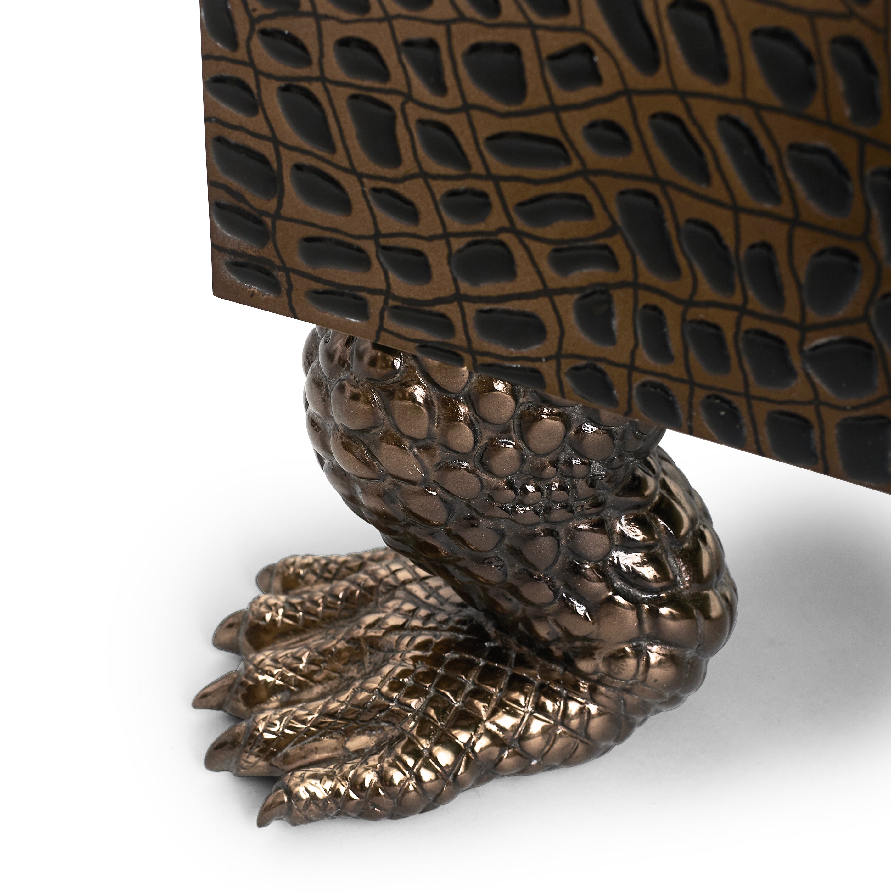 Body is finished in jet-black resin and sits on matching cast and cladded brass crocodile feet