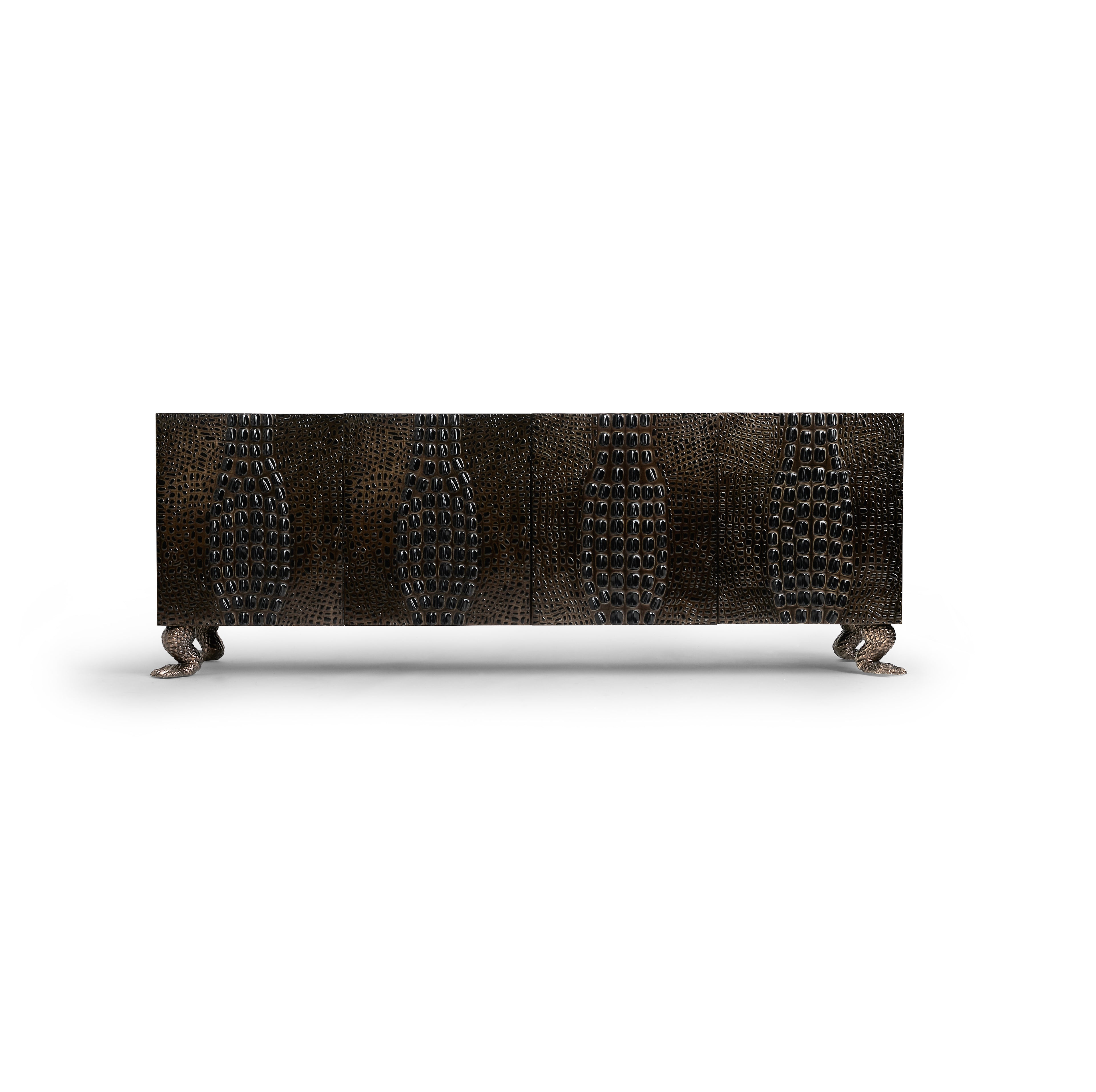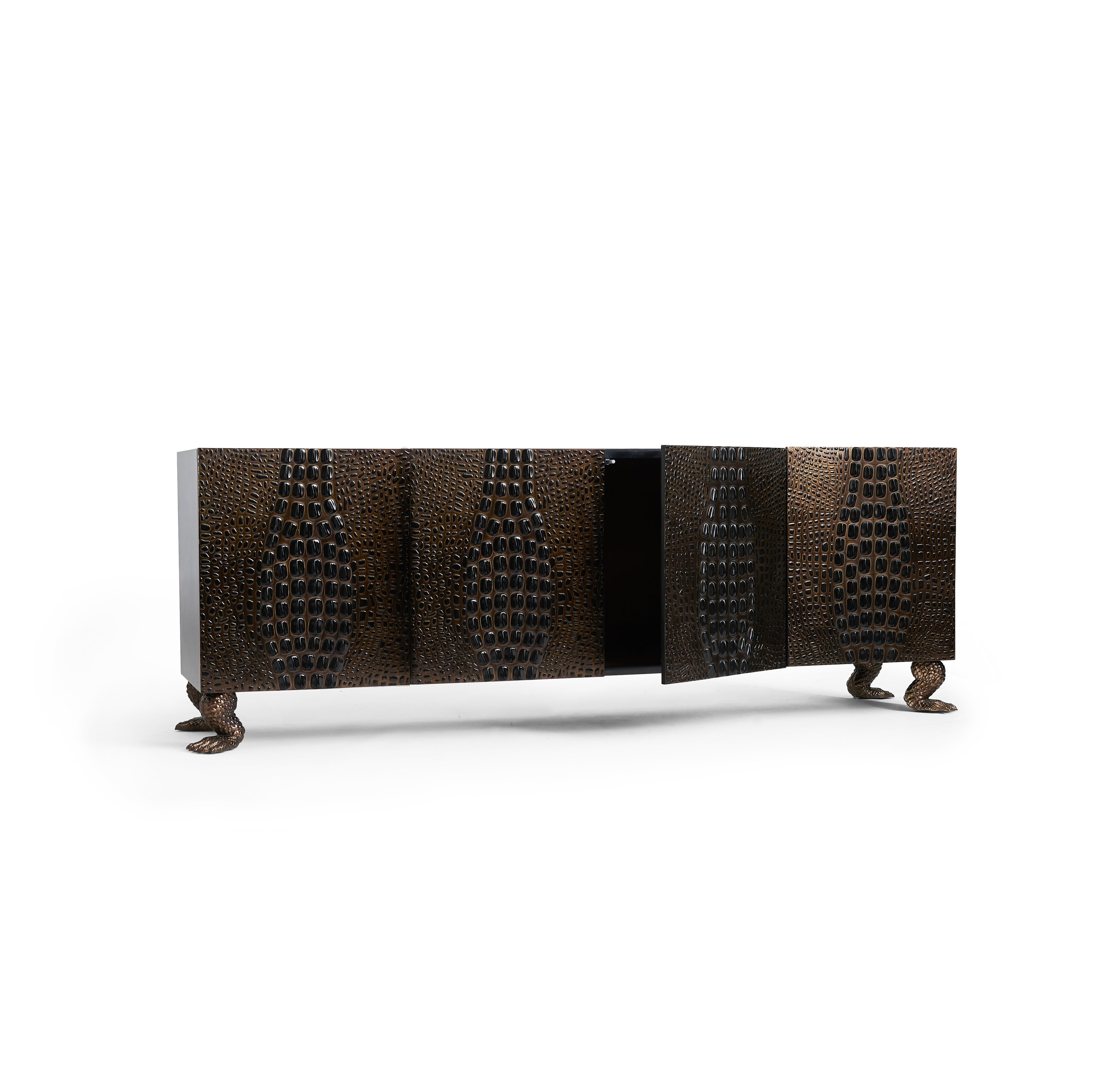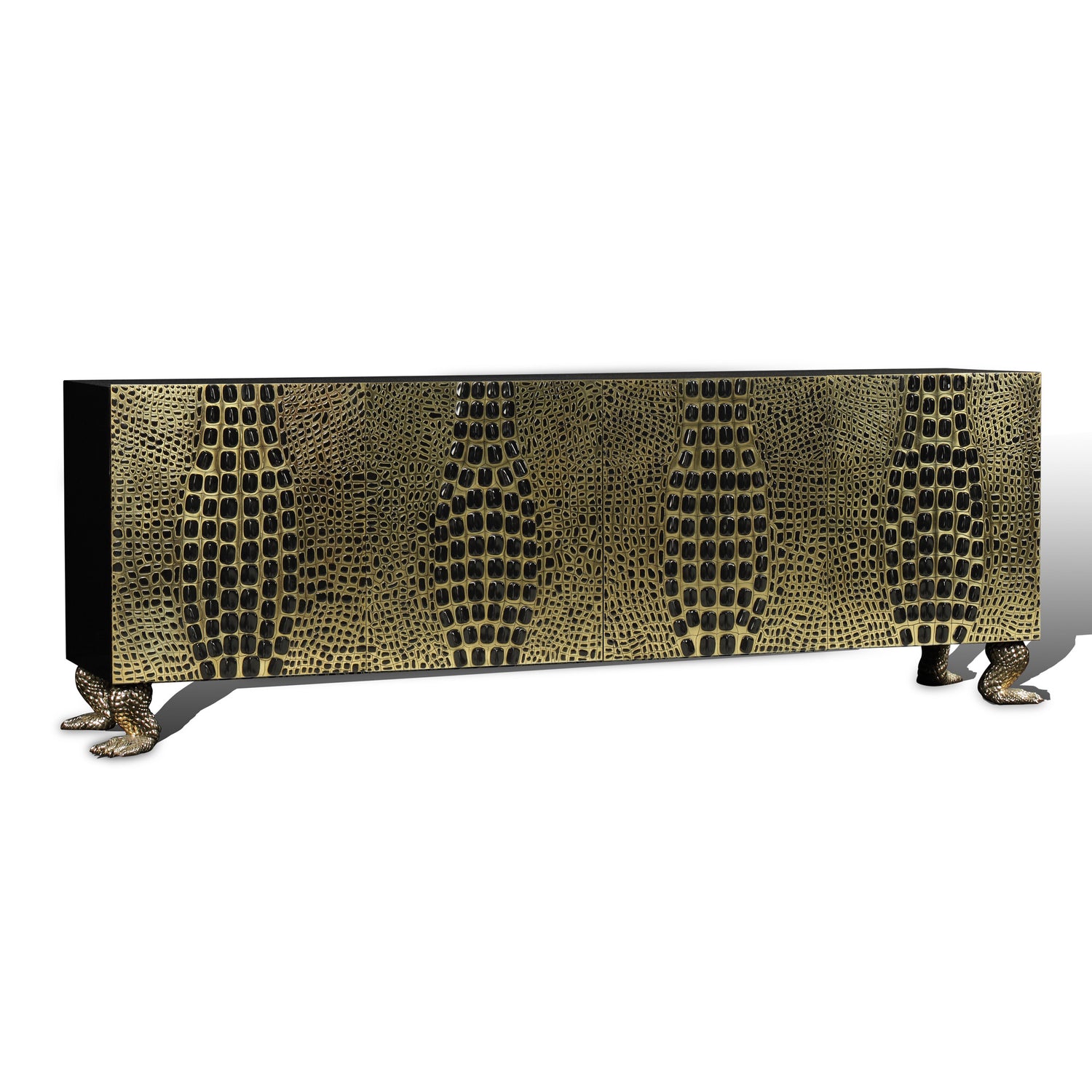 Brass door fronts are etched in a striking crocodile motif in this 4-door storage credenza by Sylvan S.F