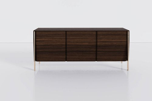 The Fortuna Dresser is suspended from its metal armature, which reveals itself as the cabinet reaches the floor
