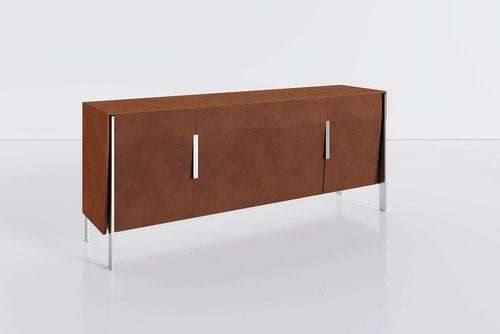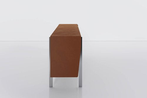 The Fortuna Sideboard gives the illusion of being precariously suspended from its metal armature, which reveals itself as the cabinet descends