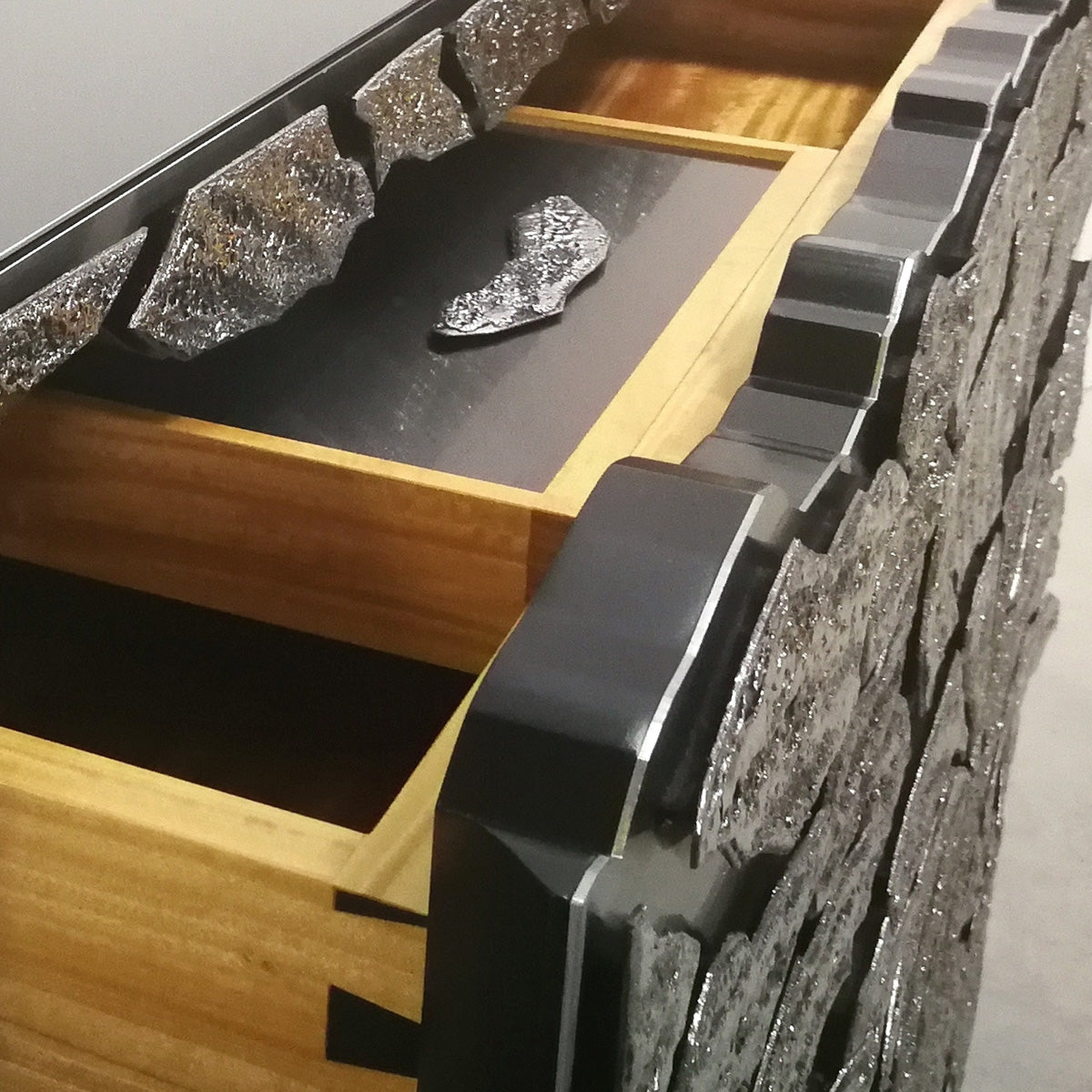 Thin copper sheets are covered with black crystal (enamel) by successive steps of cooking at very high temperatures - Then, like a jewel, they are covered with platinum
