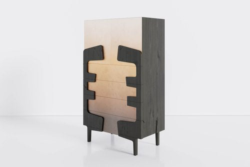 Its abstracted, three-dimensional face gives the hercule tall cabinet an almost tribal sensibility