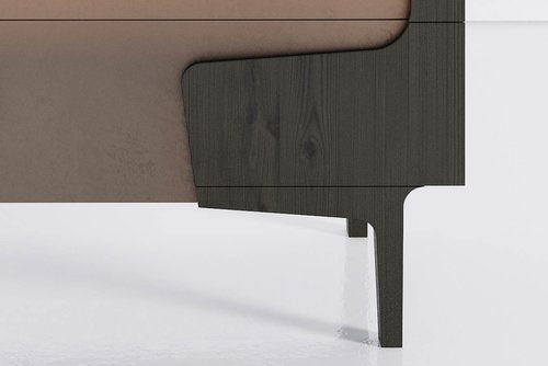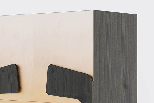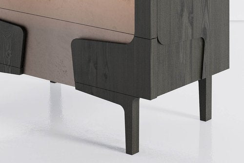 A metal skin underlaid behind the wooden drawer and door pulls offers an effortless storage access