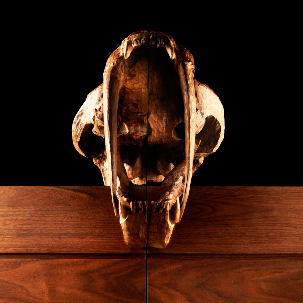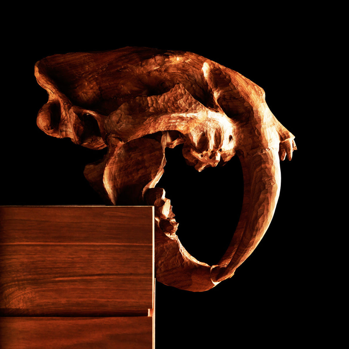 The hand carved wood sculpture of the saber tooth’s skull functions as the handles for this architectural cabinet.