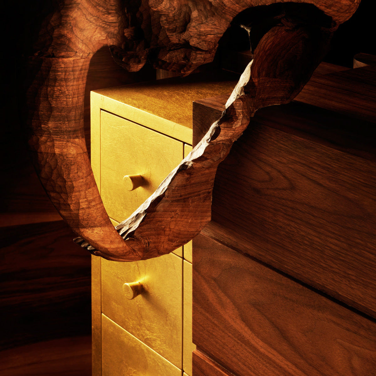 Once the doors are opened, the crumpled gold leaf shines through in the frame, drawers and shelves.