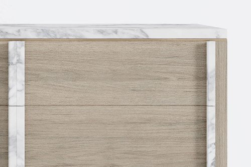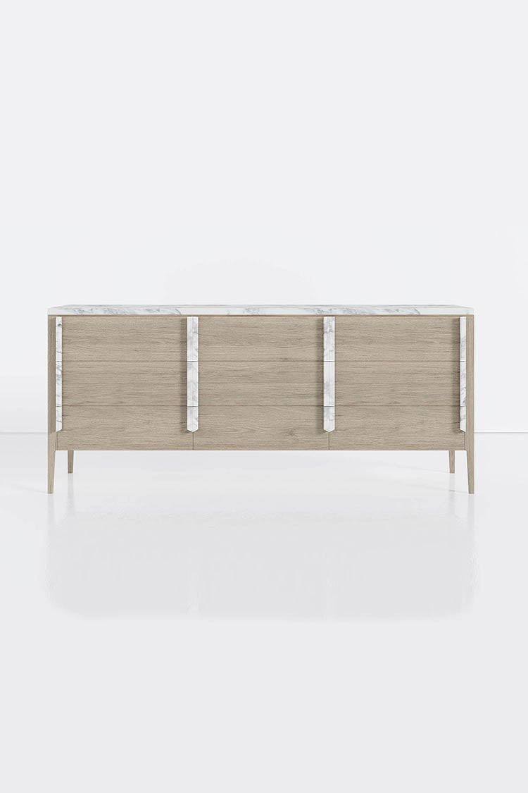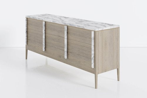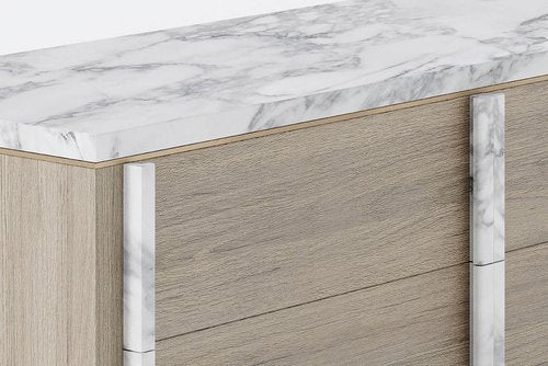 The Komodo Dresser features sensuously carved marble pulls which travel down the face of the cabinet and echo the marble top