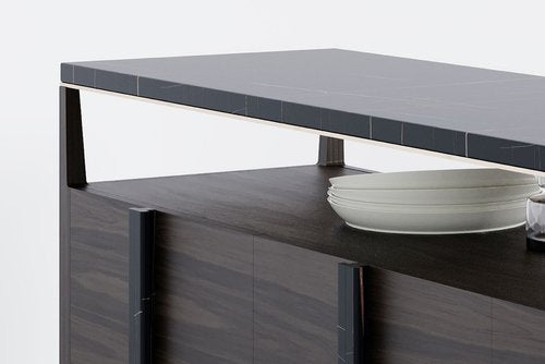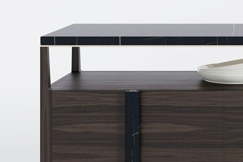 The Komodo Sideboard features sensuously carved marble pulls which travel down the face of the cabinet and echo the marble top