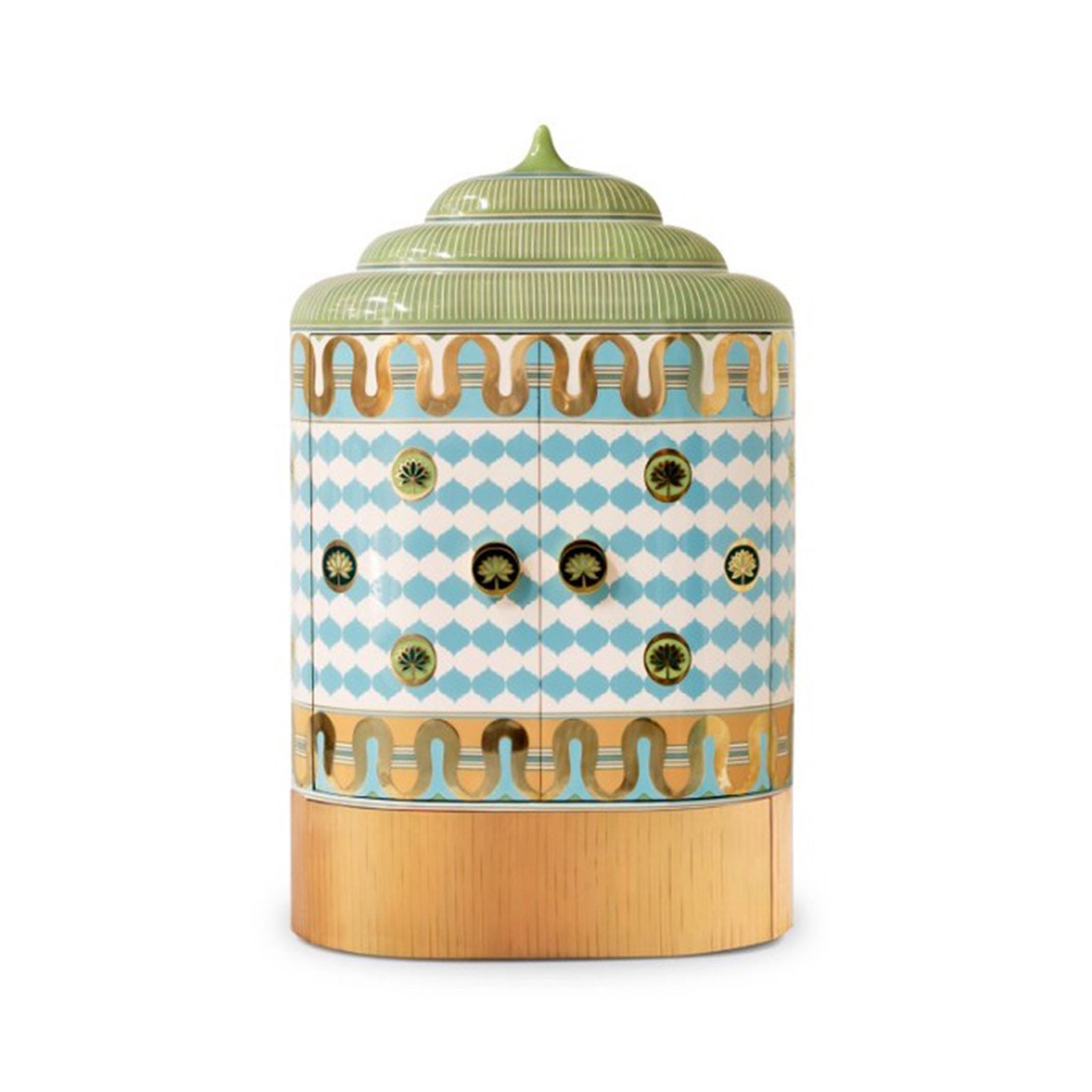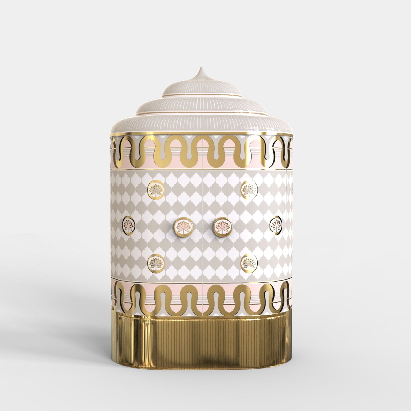 Lotus Sanctum Basra is inspired by the purity of the lotus. It is gorgeous in hues of white with brass inlay. The inside is fully covered in brass.