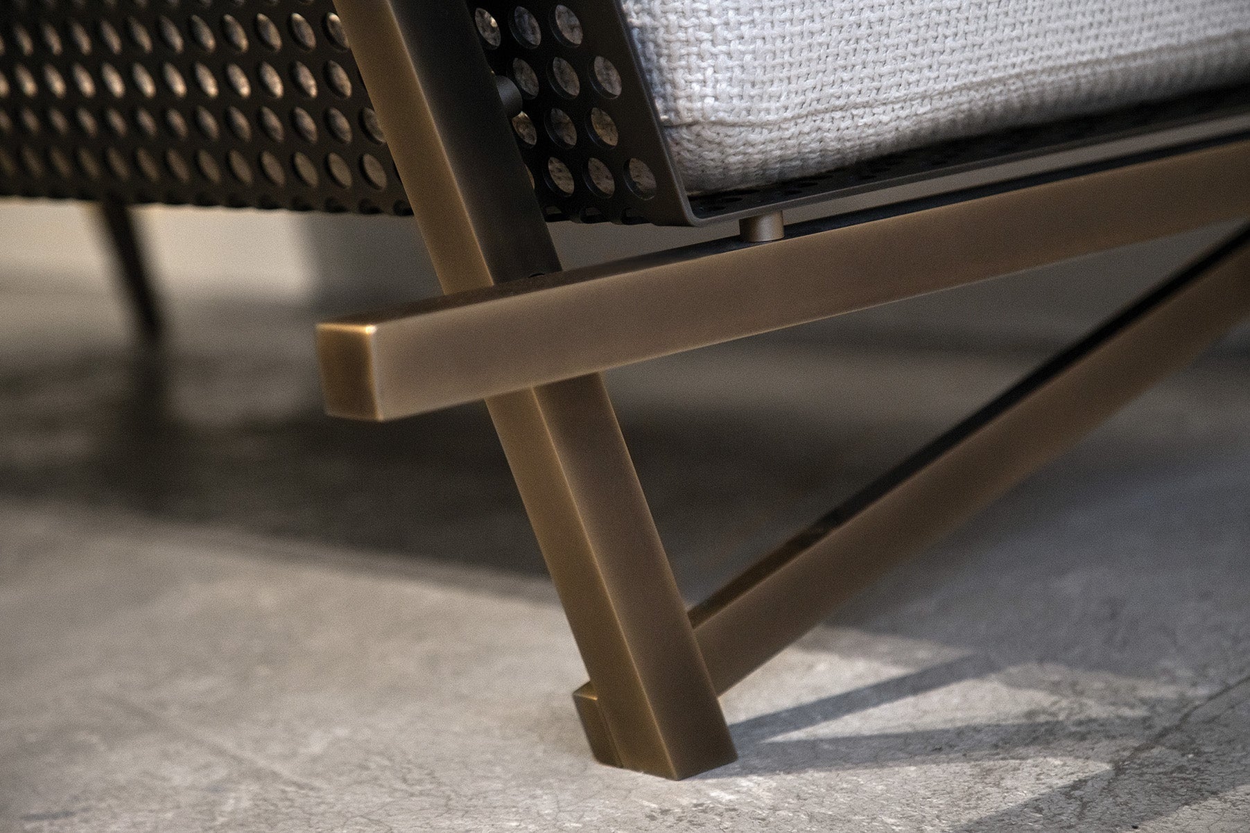 An interior sofa in patinated brass that revolves around function