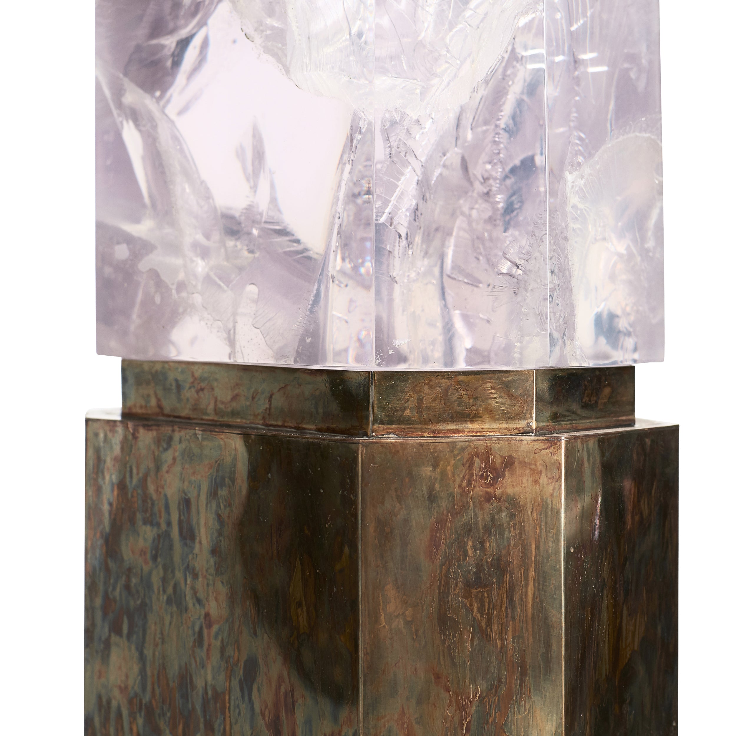 The Mineral Obelisk Lamp is made with a beautiful clear amethyst ice-cracked resin and an industrial tortoise brass base with a clear crystal coat
