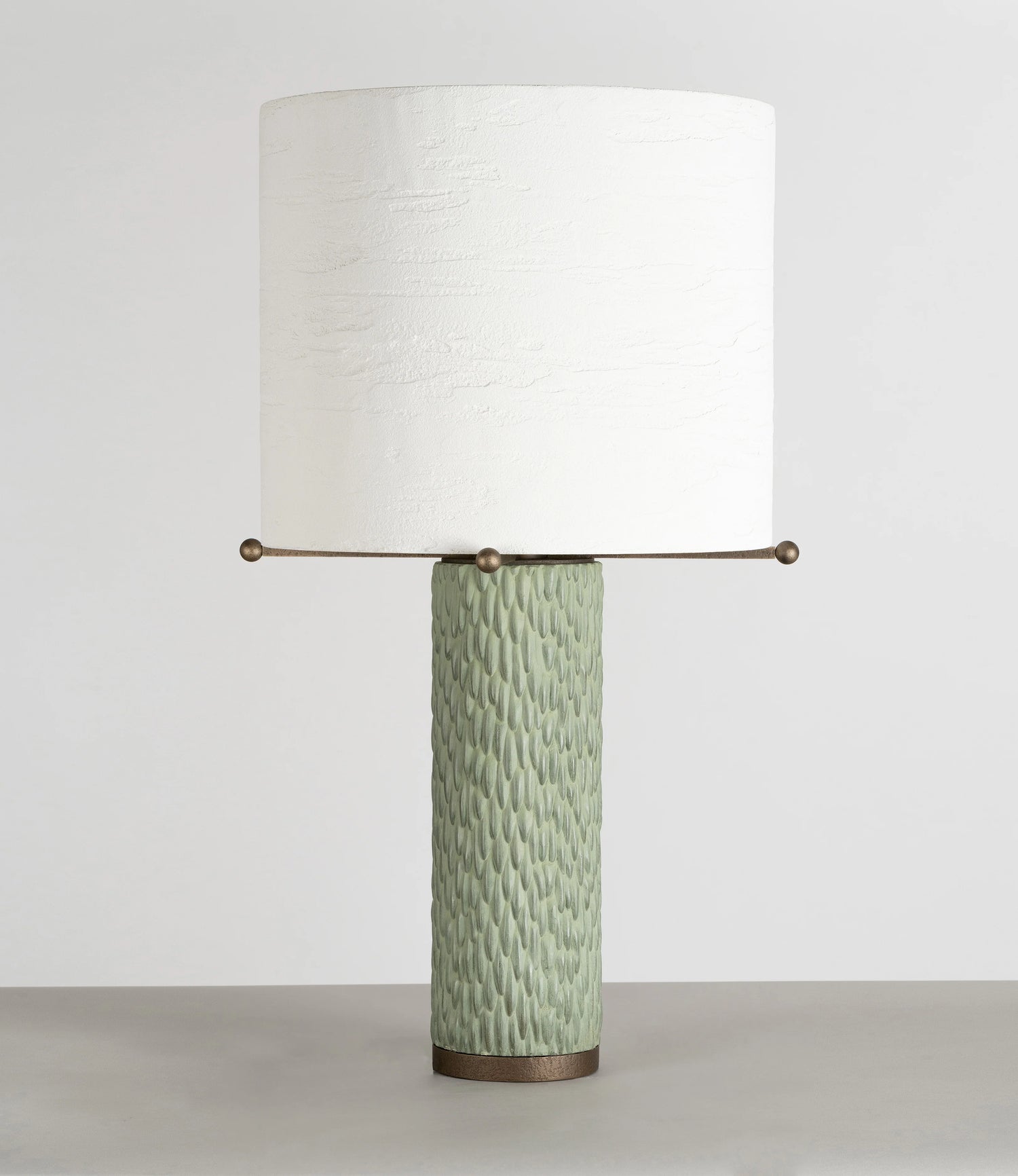 A majestic table lamp that astonishes with its skilful blend of a brass shaft with a bronze patina and a staff shade