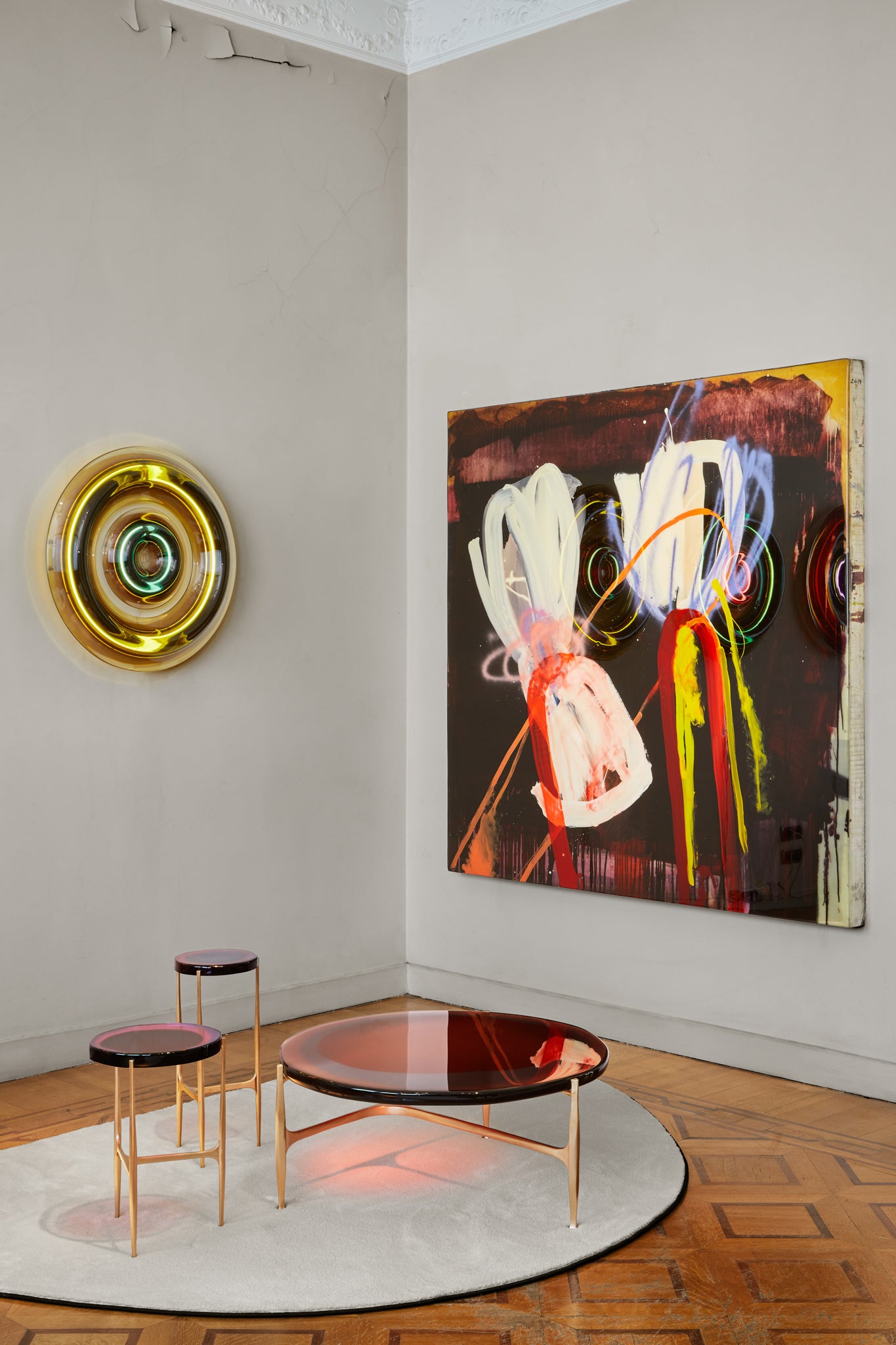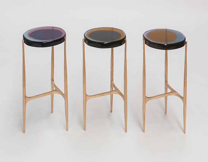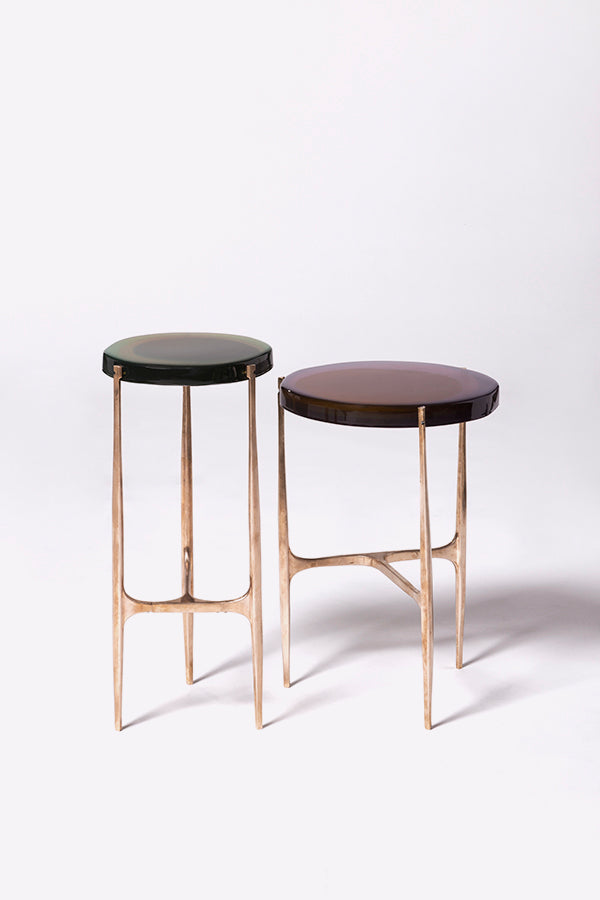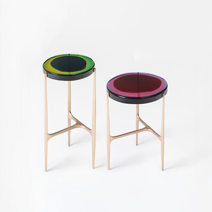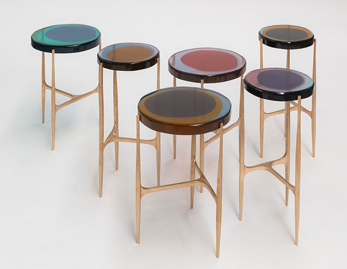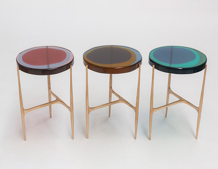 Agatha coffee table series is enlivened by an irregular circular top in transparent epoxy resin that holds a dialogue with light.