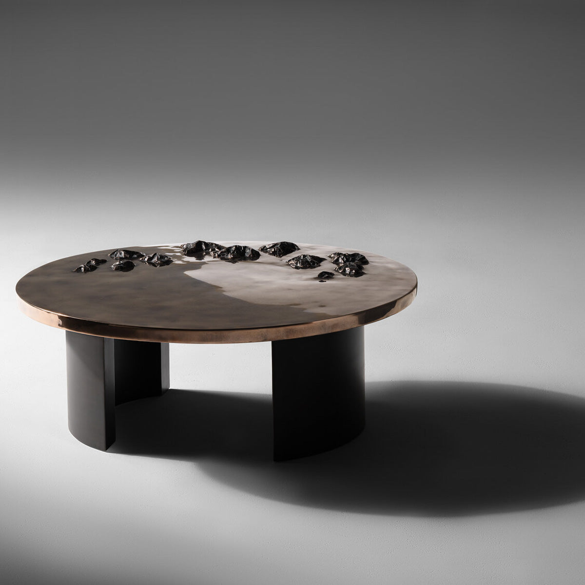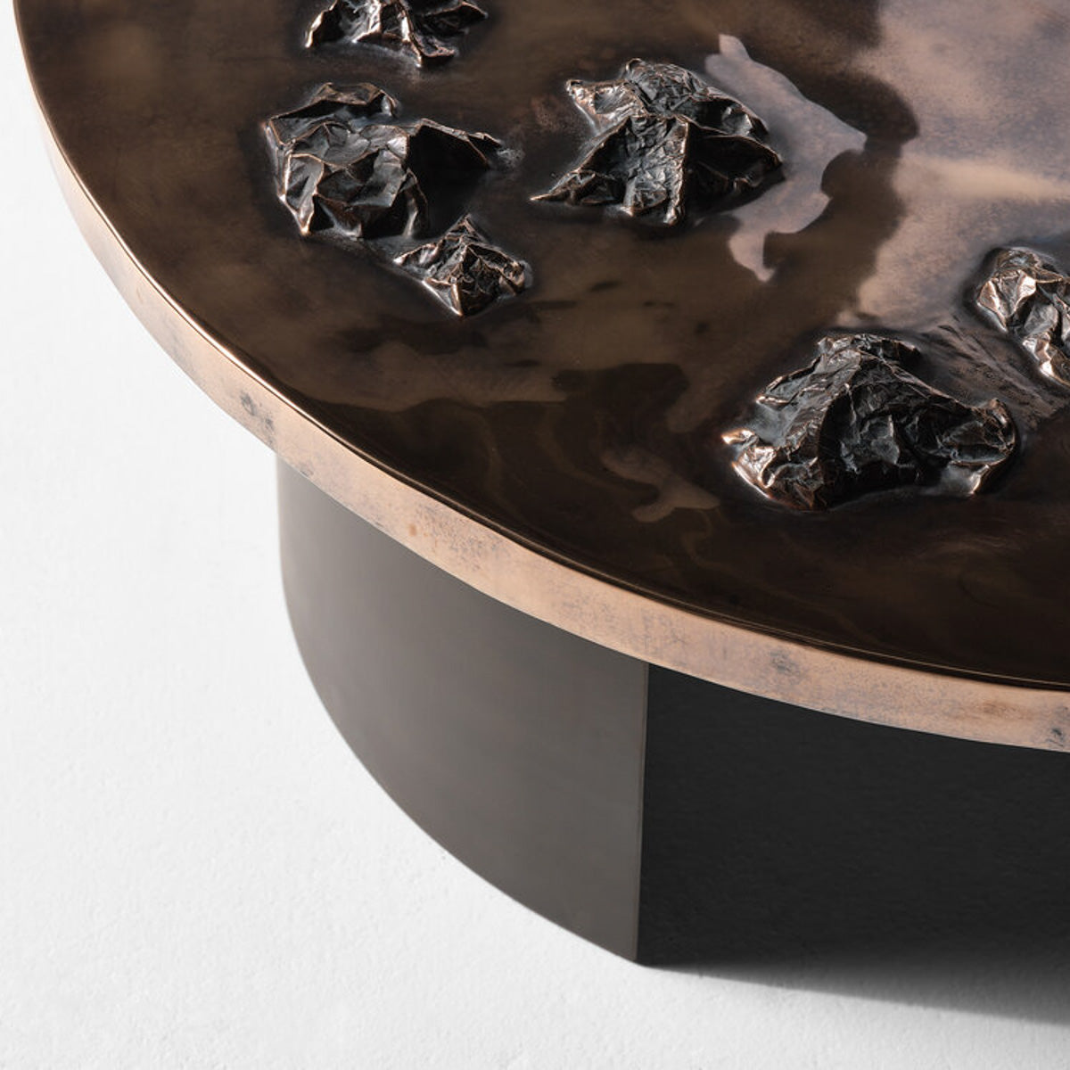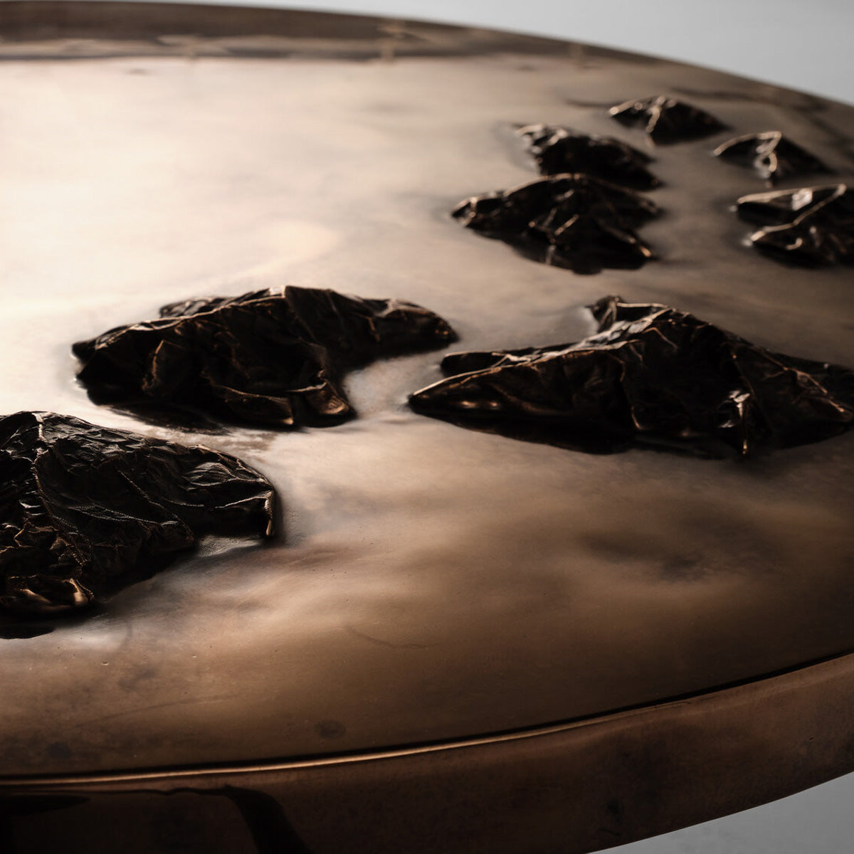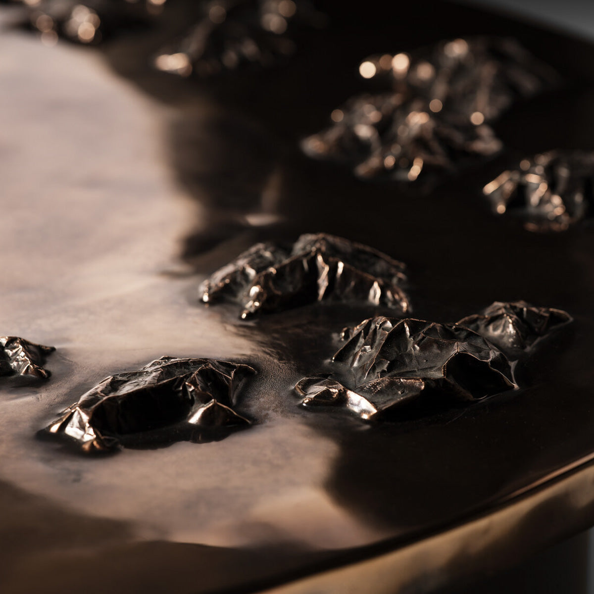 Made with a textured bronze top that reflects an organic mountain topography rests upon a sculptural blackened stainless steel base