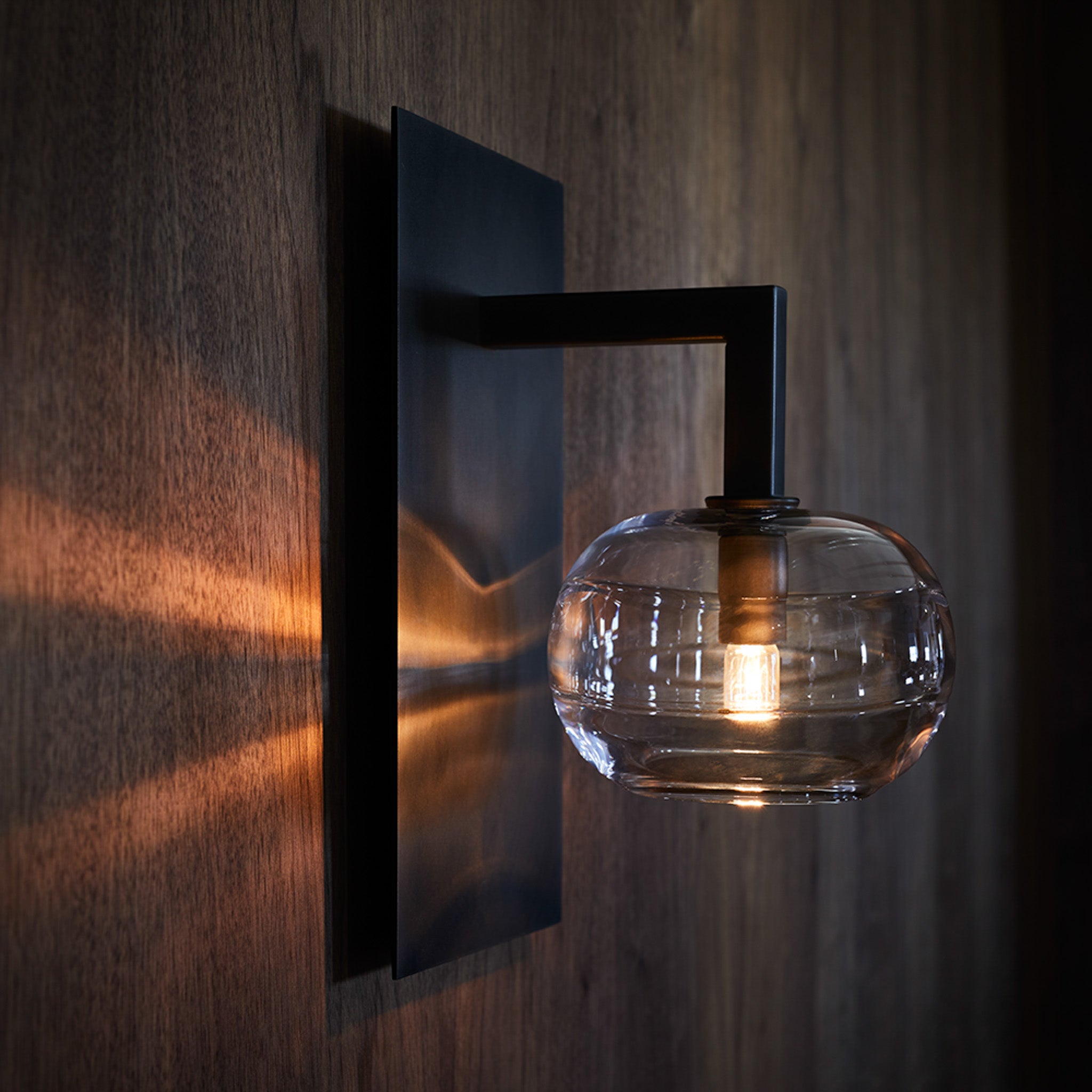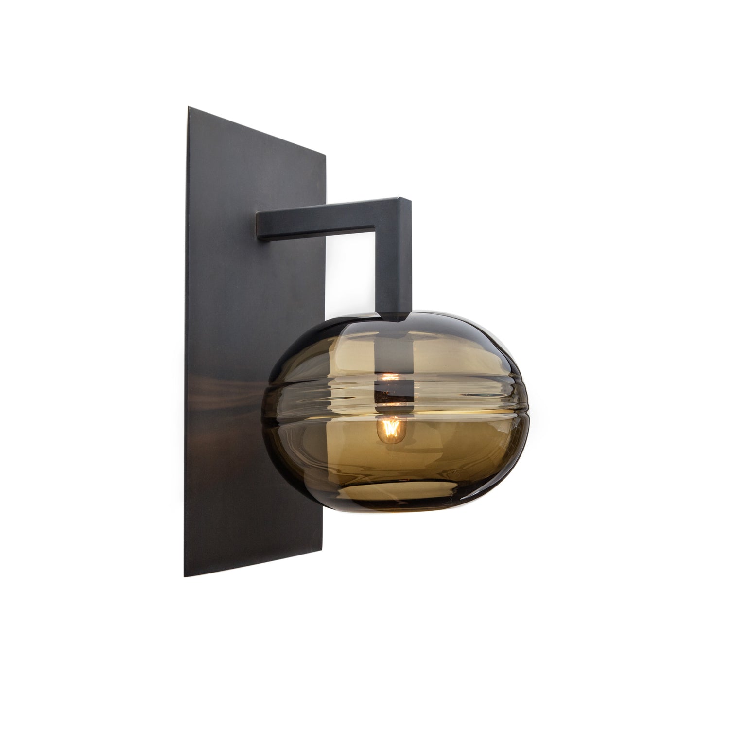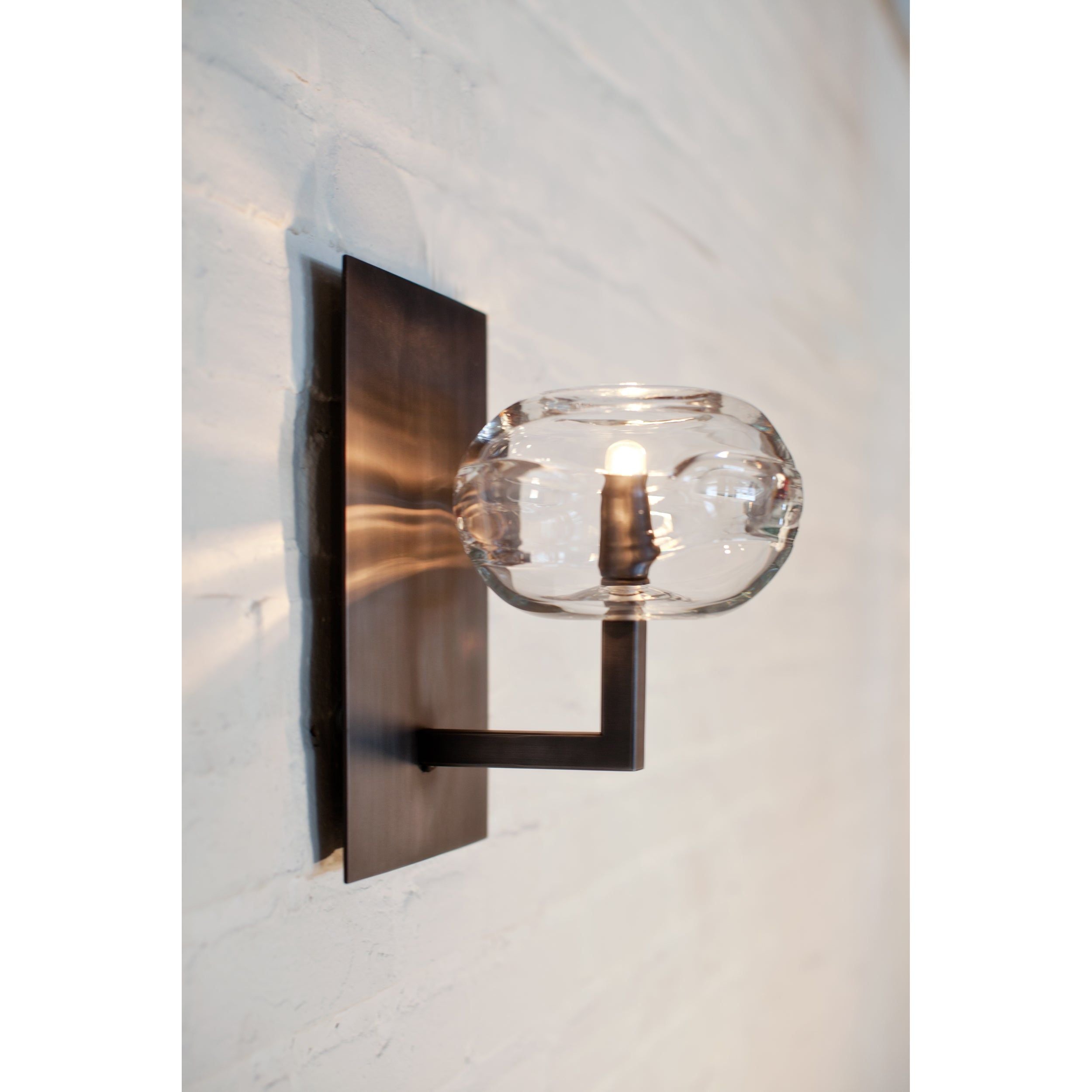 Hand-blown, sculpted glass crystal shade with thick clear optic lens on metal backplate. Sconce can also be orientated in opposite direction