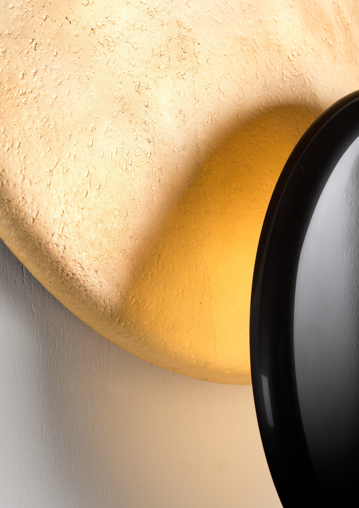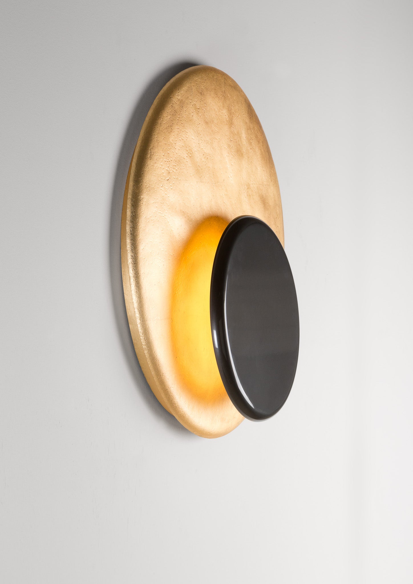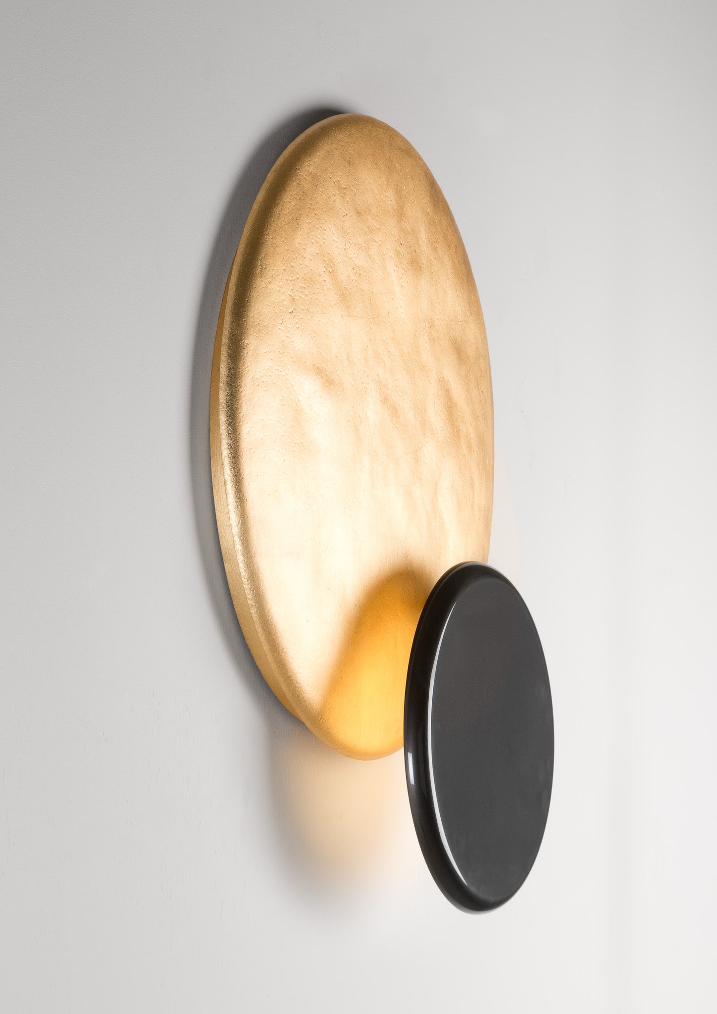 In copper-leaf gilded or hot-blued hammered steel, the Eclipse sconce is a gentle blend of textures and colors, animated by the movement of rotation