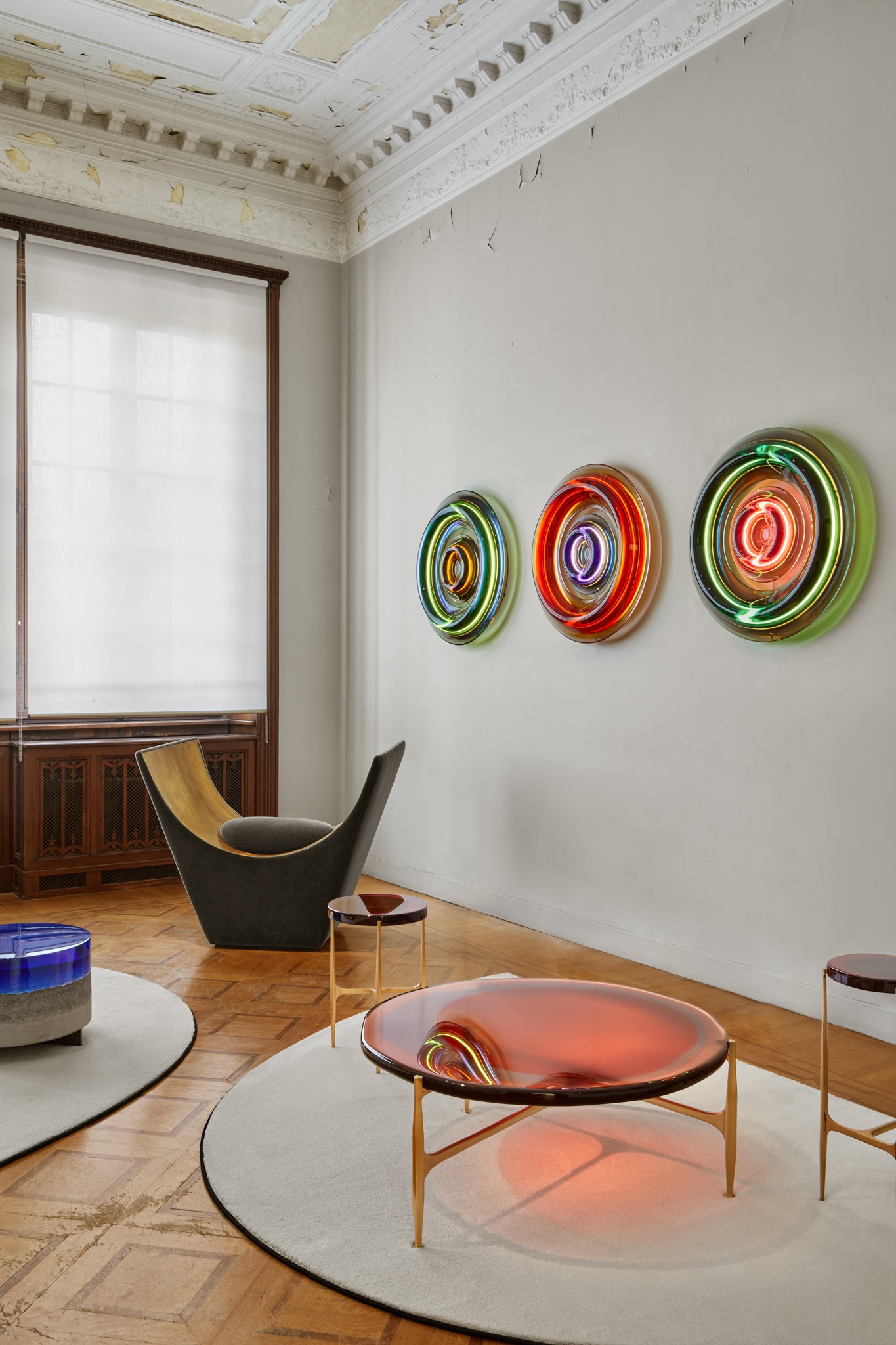 The interplay between the epoxy resin and the dimmable neon lighting creates vivid light sculptures, handcrafted entirely in our atelier.