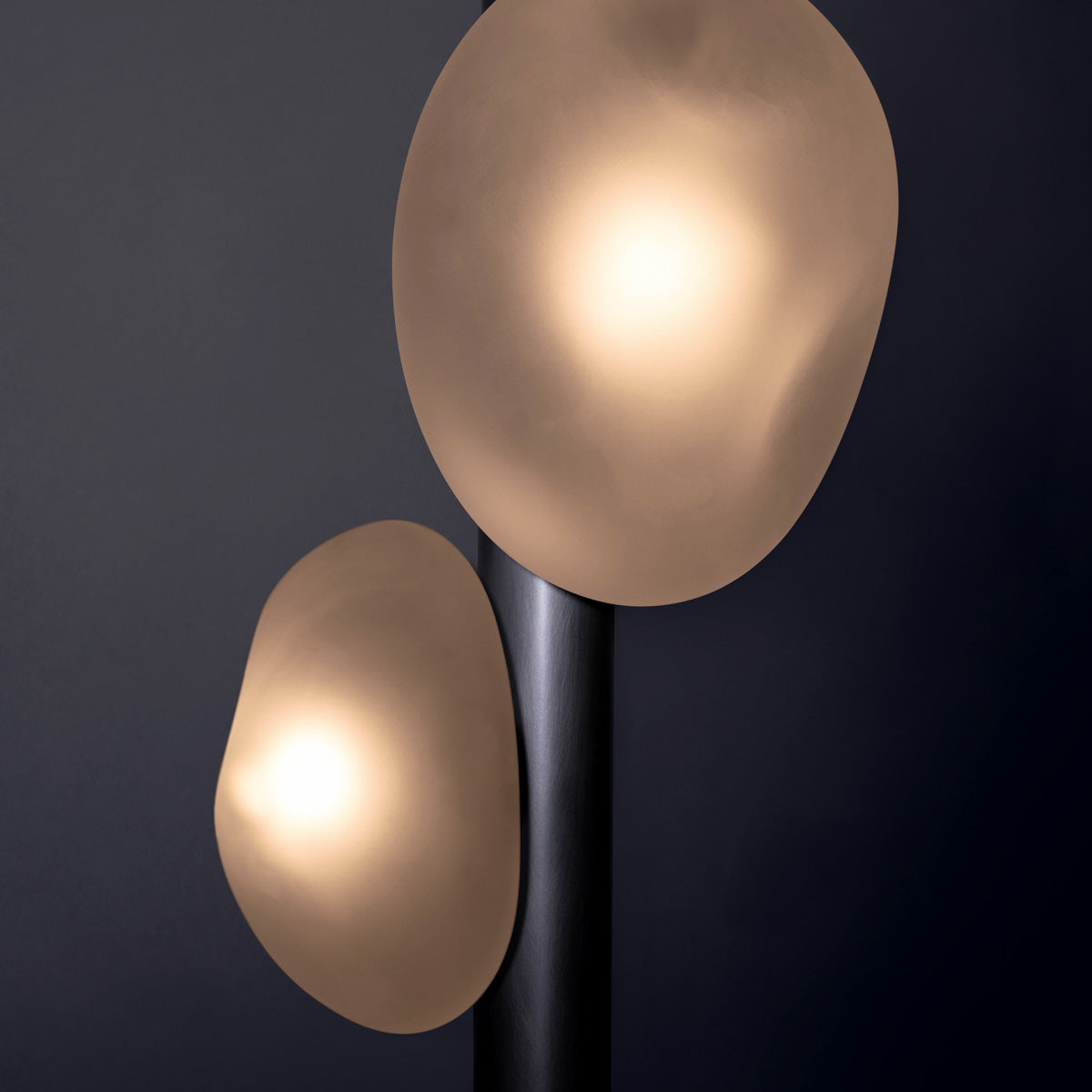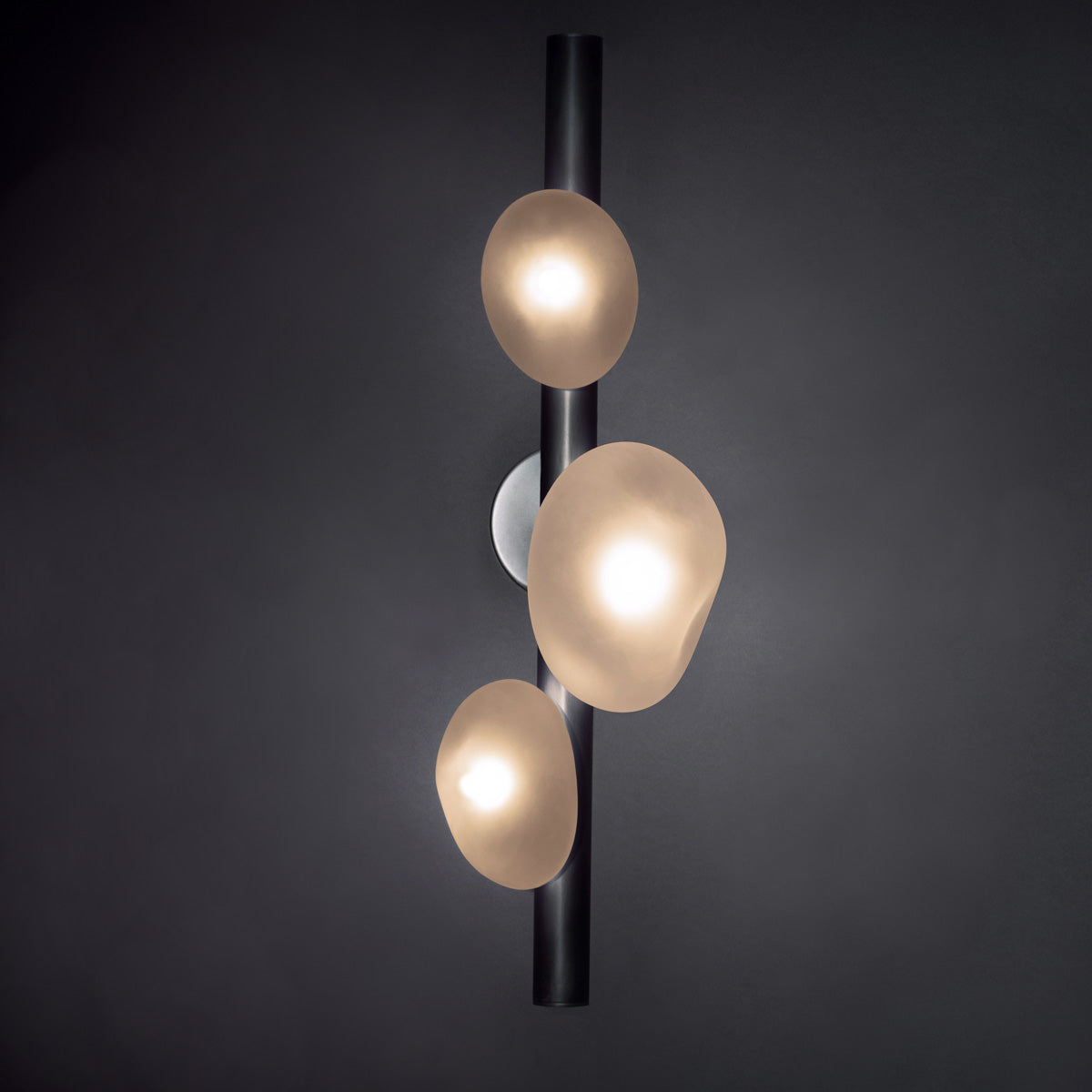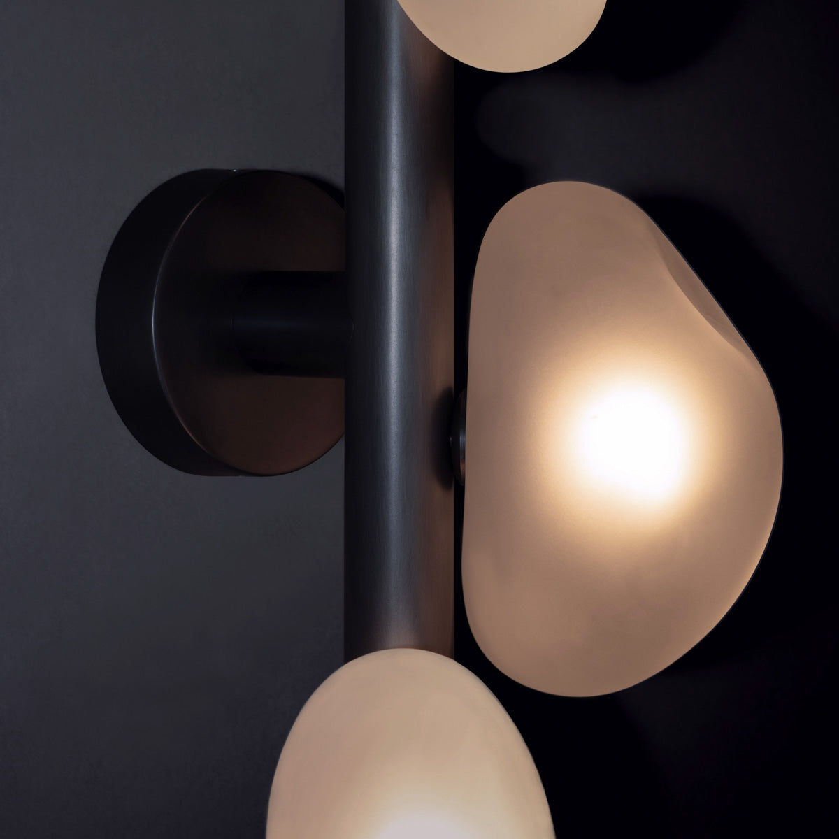 Hand blown organic glass crystal forms clustered along monolithic metal structures