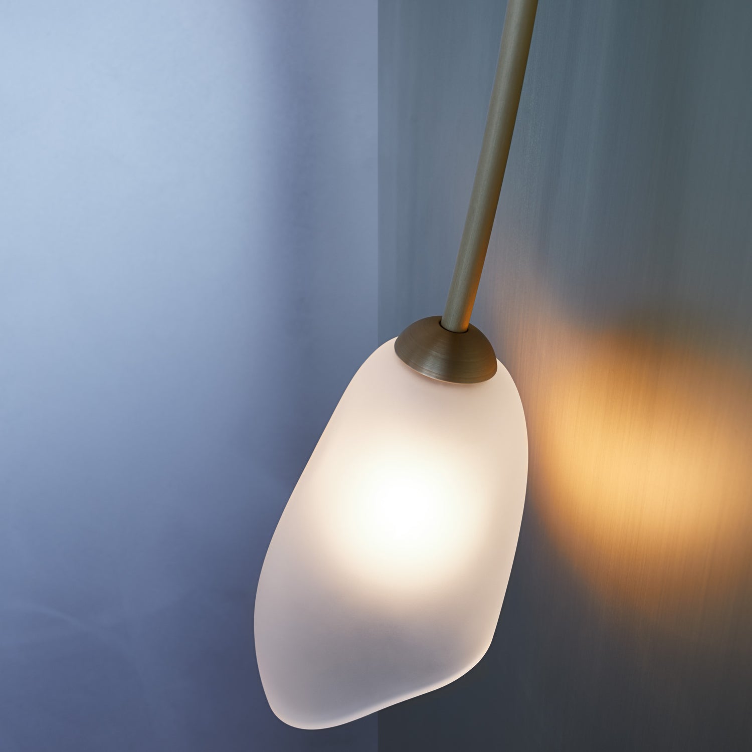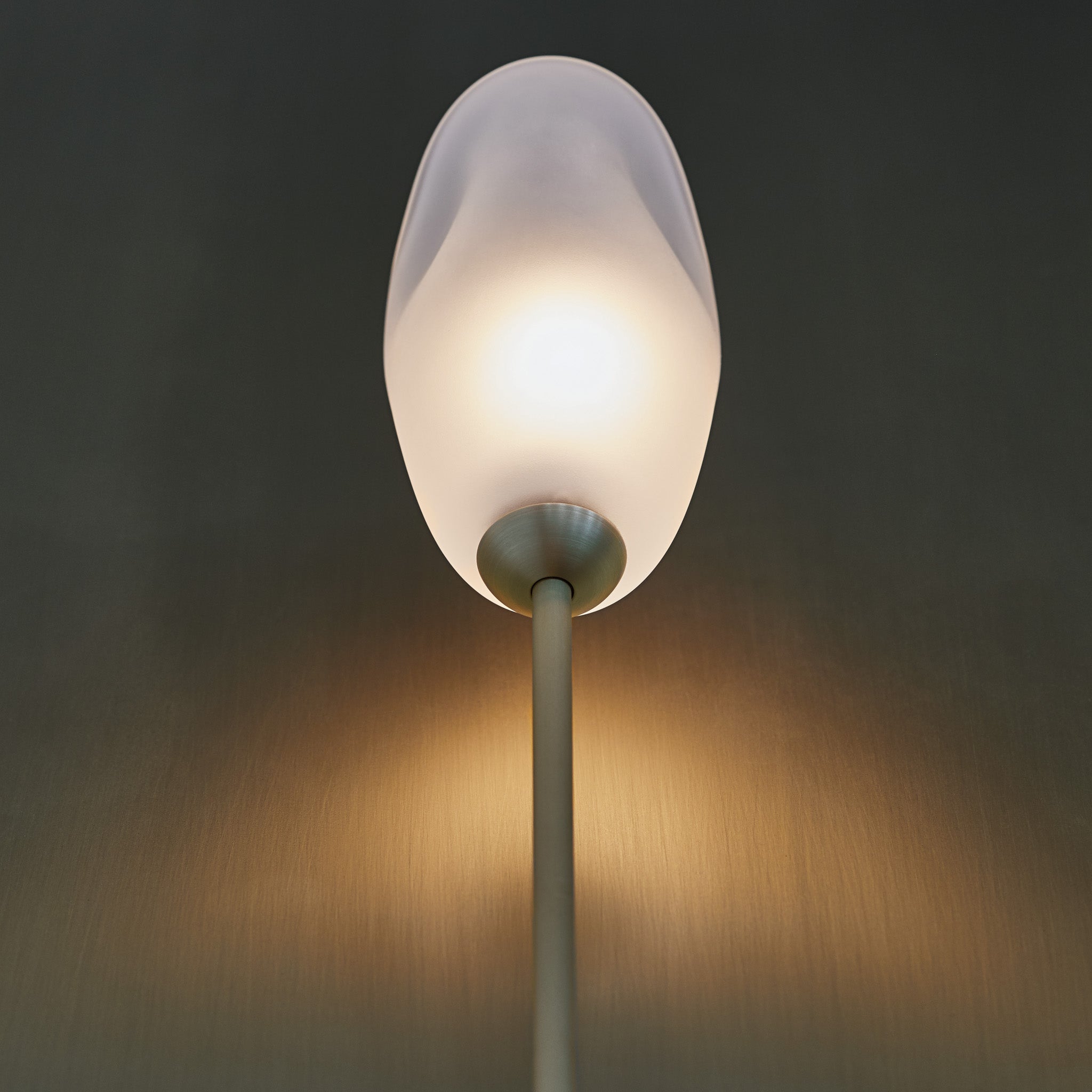Two hand-blown, sculpted glass crystal shades sprouting from brass crescent arms on metal backplate
